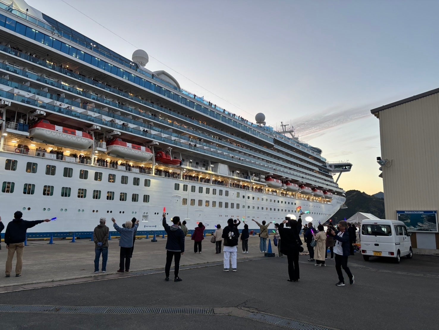 街なかでは、商店街を中心とする各所でイベントが行われ、多くの外国人クルーズ客が市内散策を楽しまれました。出港時には、悳華クレインズ'舞太鼓による演奏やクルーズサポーターによるペンライトでのお見送りも実施し、港や街なかが歓迎ムードでにぎわう寄港となりました。
