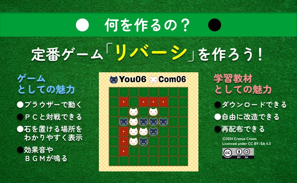 本書では、JavaScriptを使い、定番ボードゲーム「リバーシ」を作ります。作ったリバーシは自由にカスタマイズしたり、再配布したりすることができます。