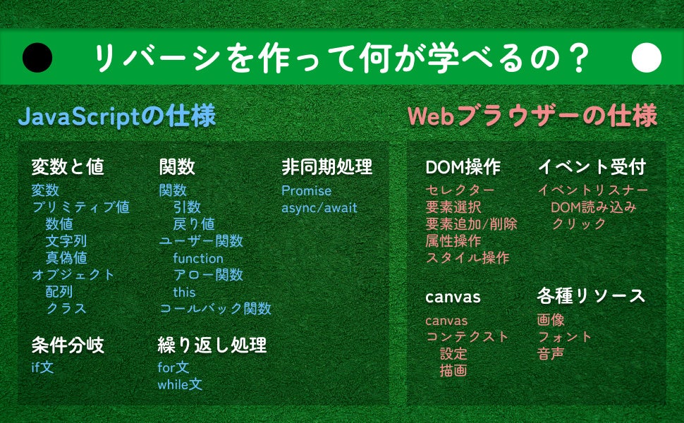 リバーシを作りながら「JavaScript」の仕様、「Webブラウザーの仕様」をじっくりと学べます。