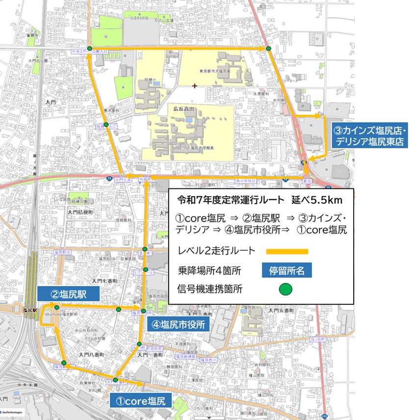 長野県塩尻市(市長:百瀬 敬、以下 塩尻市)、一般財団法人塩尻市振興公社(理事長:塩川 昌明)、アルピコ交通株式会社(本社:長野県松本市、代表取締役社長:小林 史成)、アルピコタクシー株式会社(本社:長野県松本市、代表取締役社長:三澤 洋一)、アイサンテクノロジー株式会社(本社:愛知県名古屋市、代表取締役社長:加藤 淳)、A-Drive 株式会社(本社:神奈川県横浜市、代表取締役社長:岡部 定勝)は、令和7 年5 月9 日から隔週「金曜日」「土曜日」に自動運転レベル 2 で自動運転バスの定常運行を開始します。