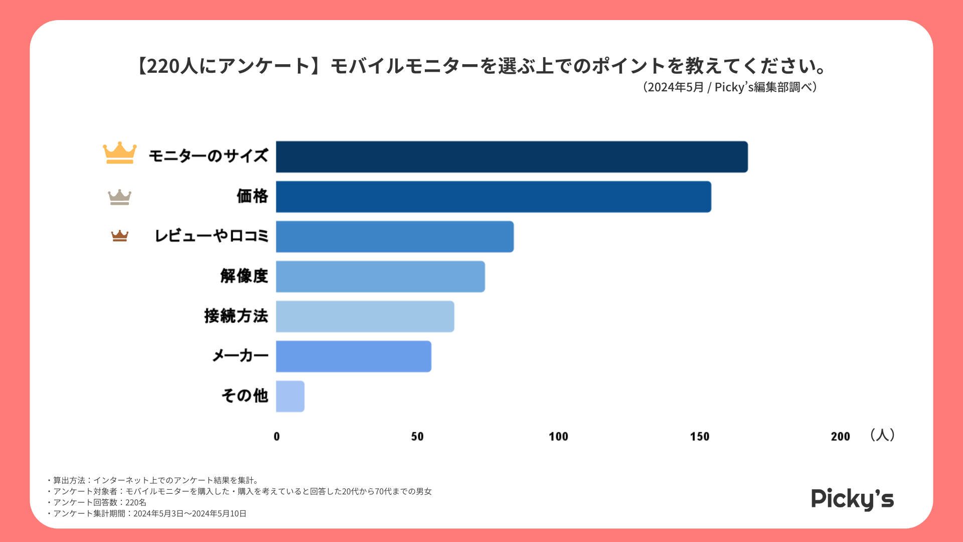 「Picky’s」は、インターネットショッピングにおいて、購入前に試せない・選ぶべきものがわからないという課題の解決を目標に、あらゆる商品のおすすめランキングや検証レビューを紹介するサイトです。このたびPicky’s(https://rentry.jp/)では、モバイルモニターについてインターネット上でアンケート調査を行いましたので発表いたします。