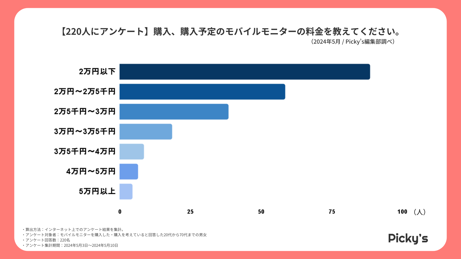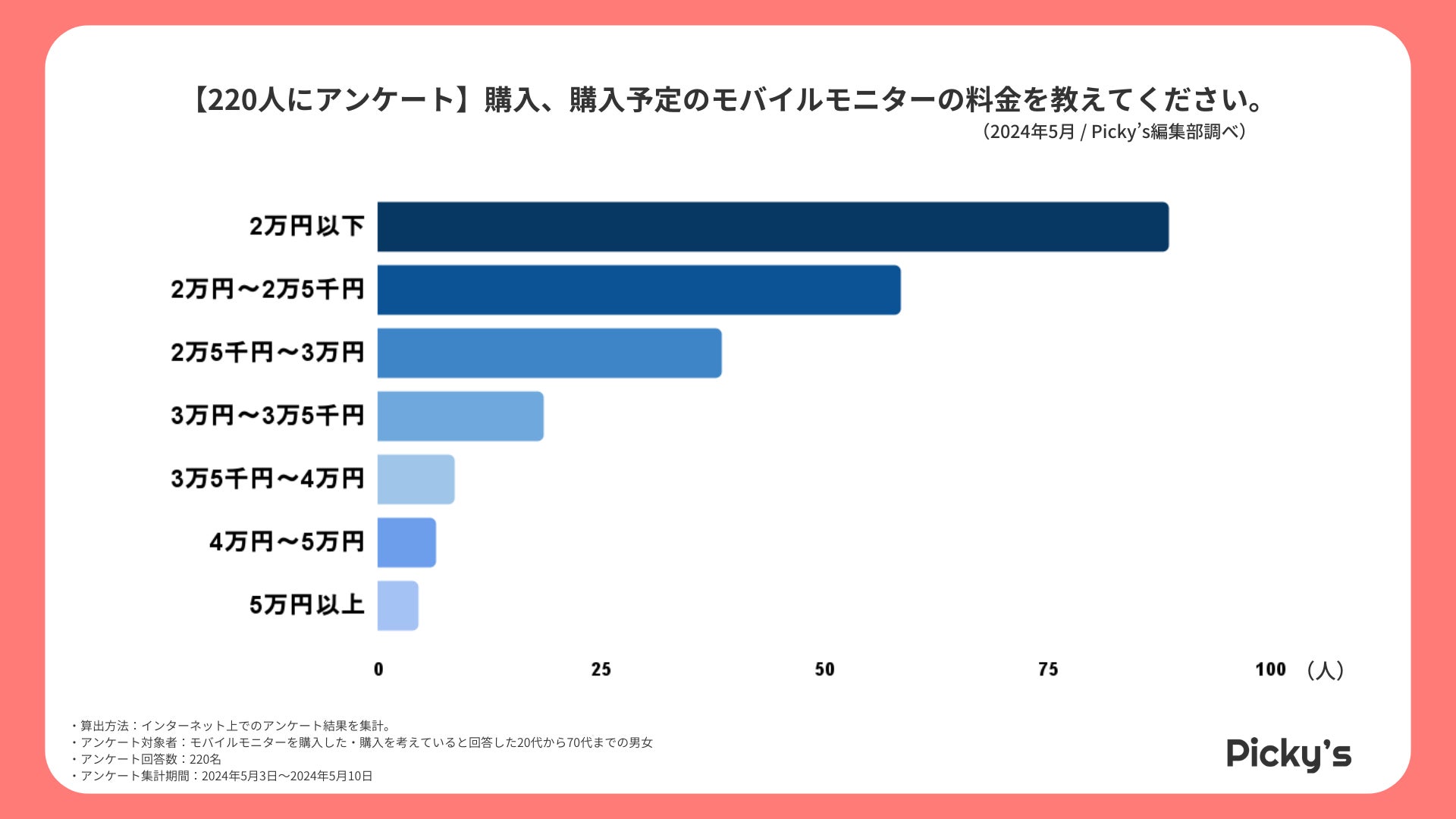 モバイルモニターの購入に際して最も多くの人が選ぶ価格帯は「2万円以下」であることが分かります。