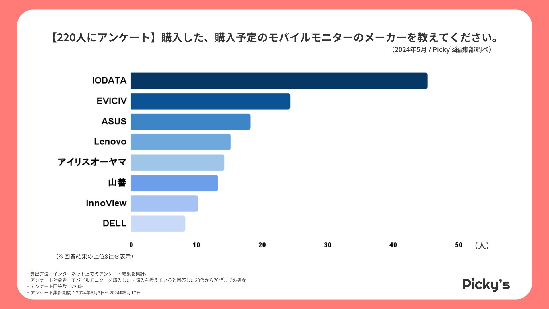 モバイルモニターの購入や購入予定メーカーとして最も人気があるのは「IODATA」であることが分かります。