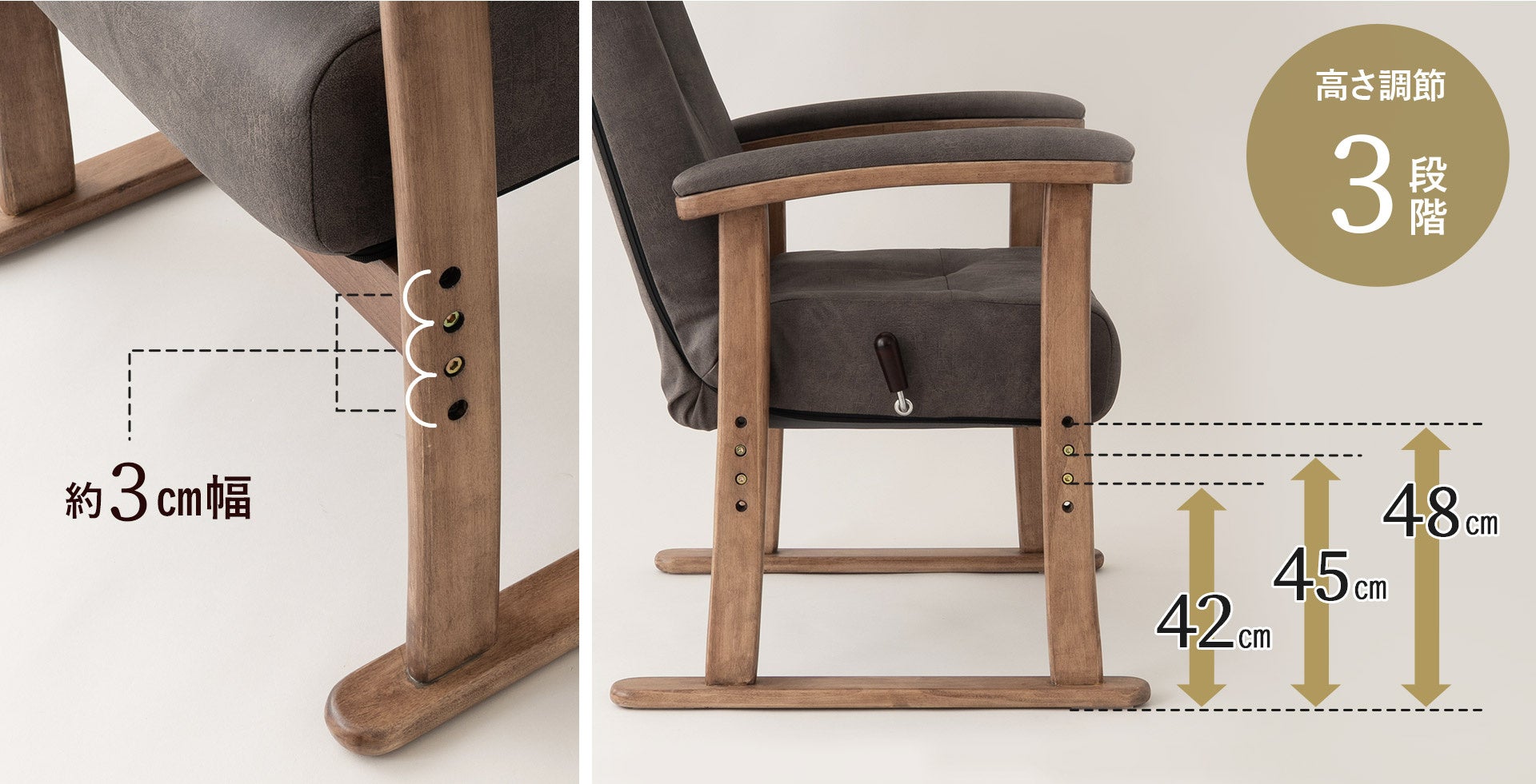 座面は、お座りになる方の体型や身長に合わせてご自宅で簡単にカスタマイズ可能。約3cm幅で調節ができ、座面高は最大で約48cmまで上げることができます。