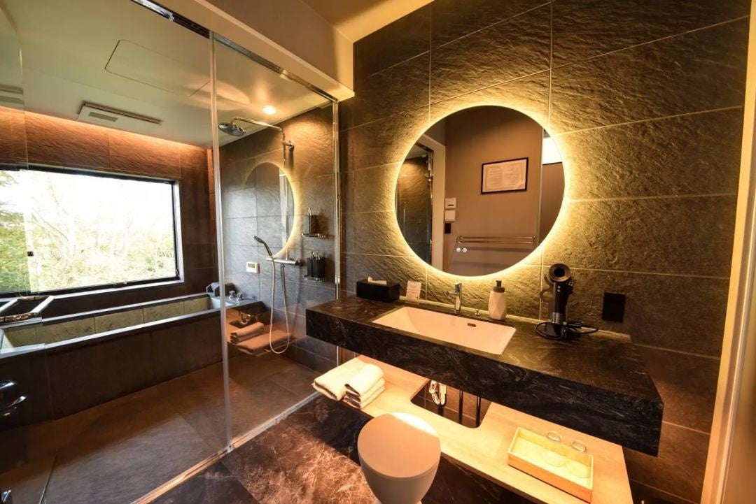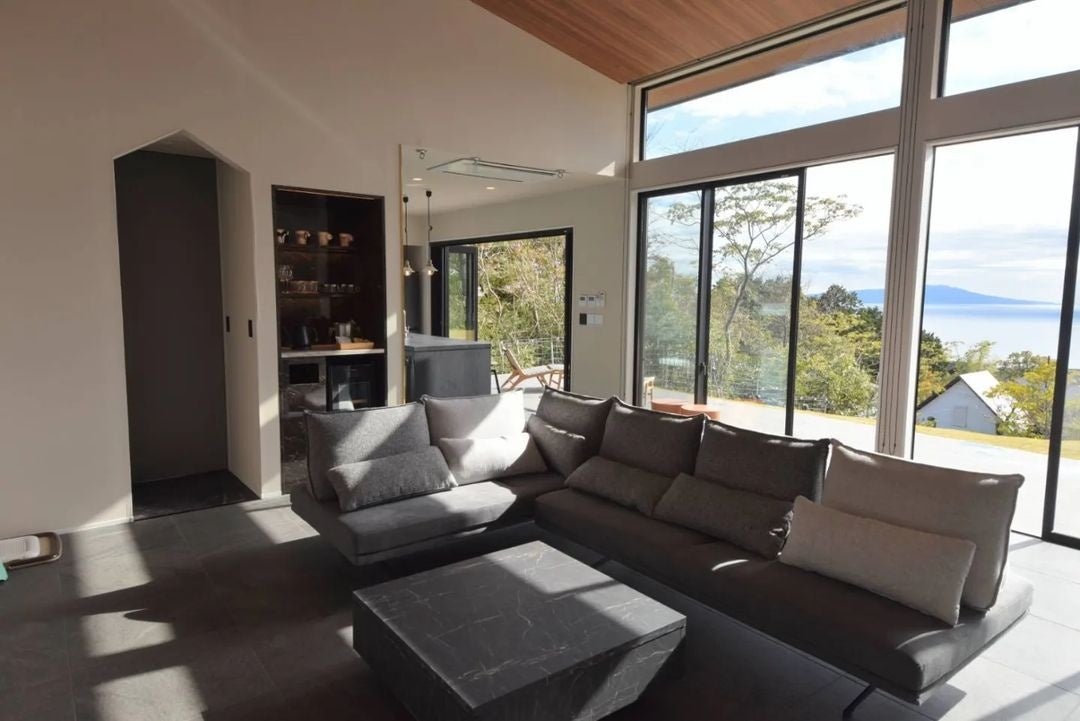 天然温泉、全面天然芝の600m2のプライベートドッグラン、全ての部屋から大島を望めるオーシャンビュー、3m×18mの巨大テラス、広々リビングでは大型スクリーンでYoutube,Netflix,Amazon Prime videoなどを視聴可能、気象条件が良いと満天の星を眺められます。