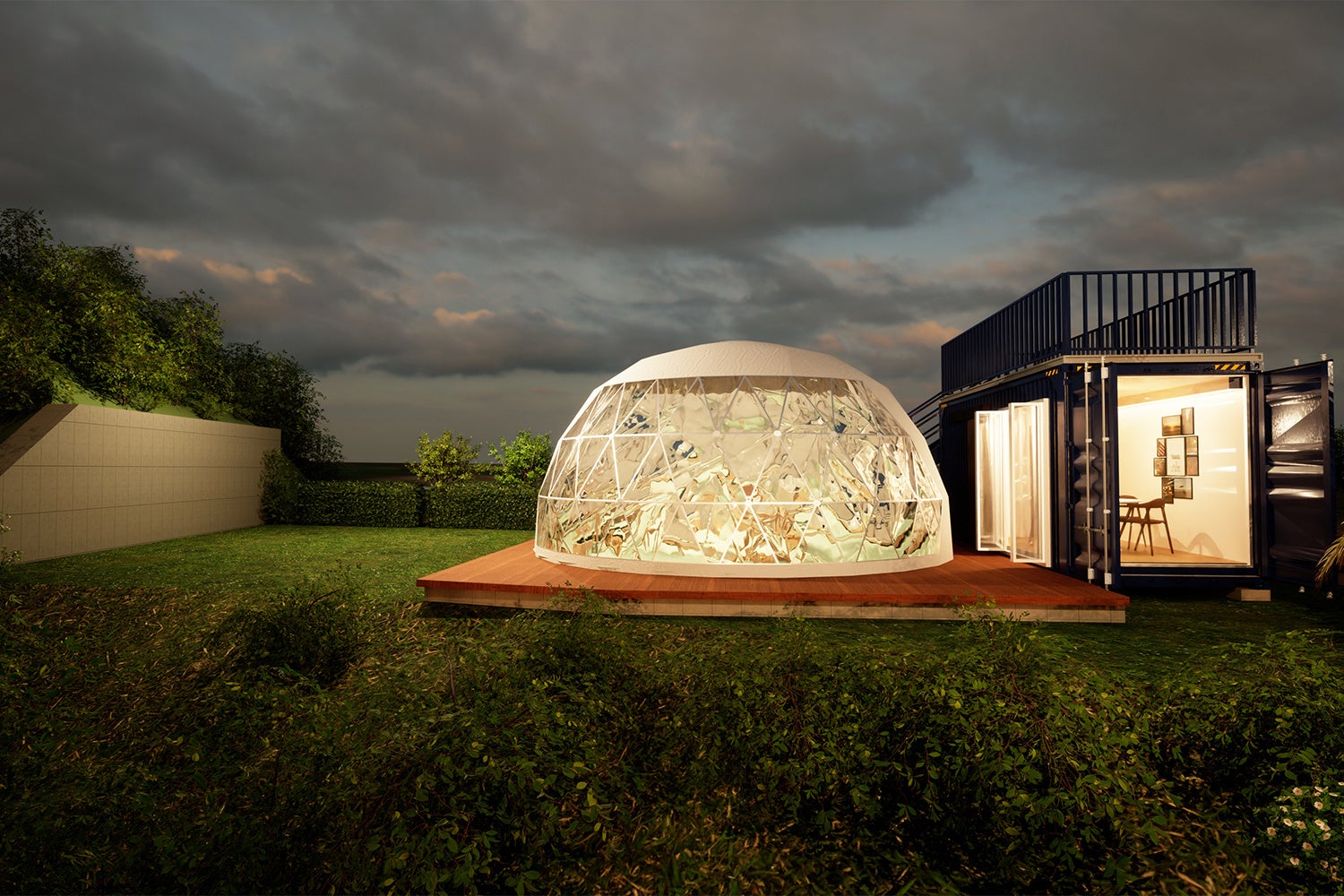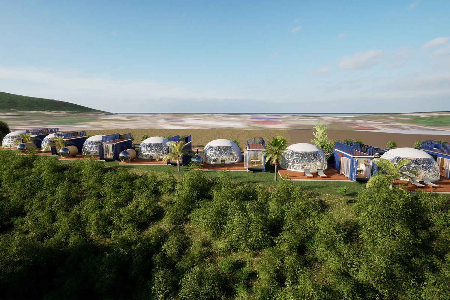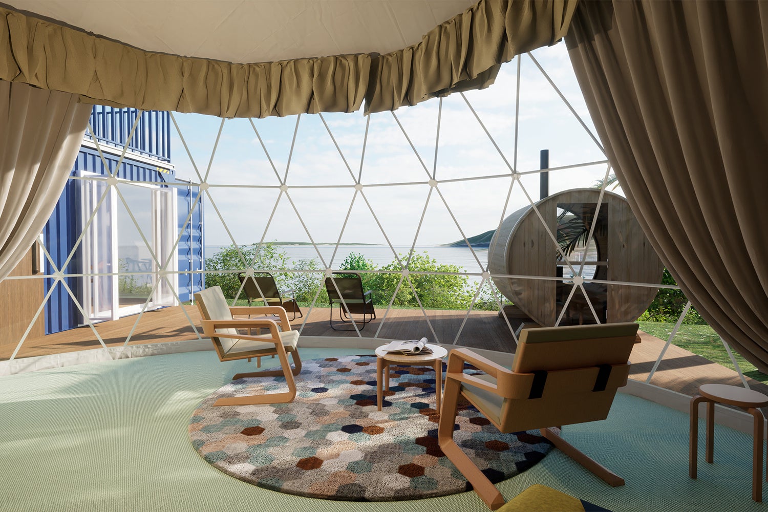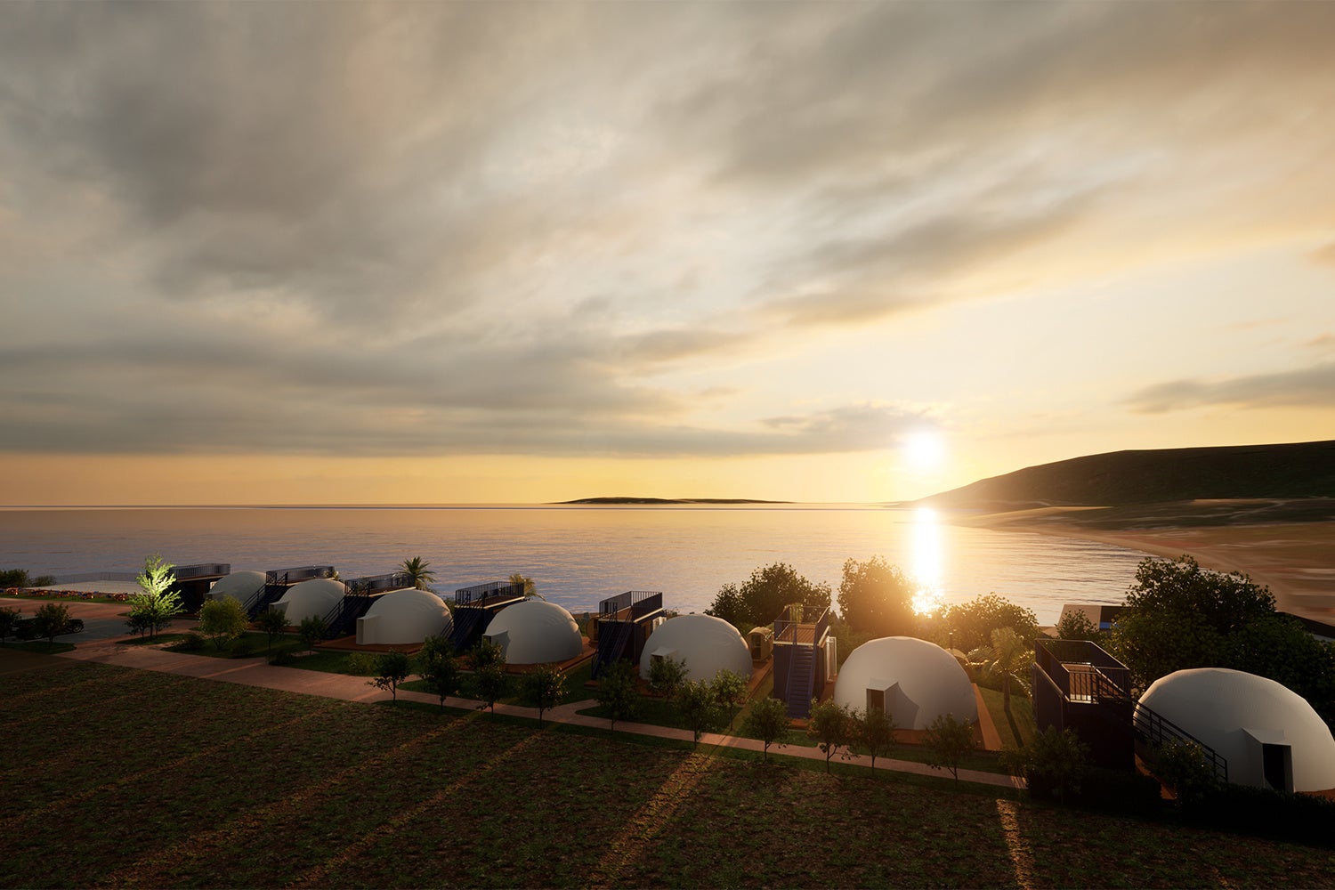 「るりいろヒルズ淡路」は南あわじ市初の仕様となる全棟オーシャンビューのドーム型グランピング施設。海と平行に横並びに配置した各テントは室内は冷暖房完備の大空間を誇る1棟貸切仕様となっております。