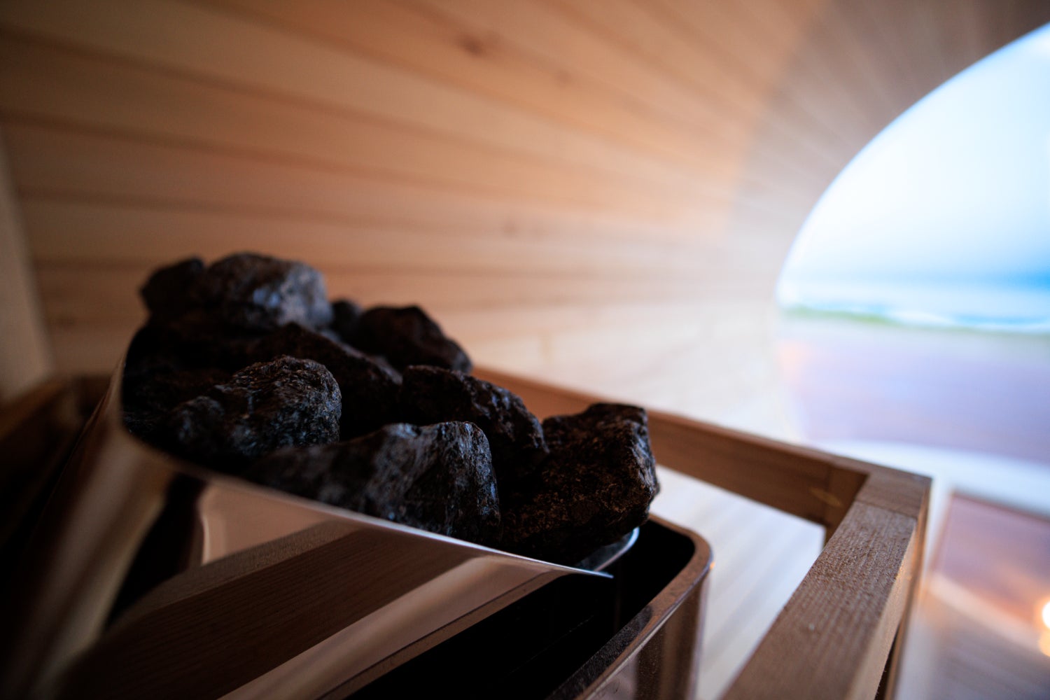 テントに隣接した大きな樽型のバレルサウナでセルフロウリュでじっくりと体の芯から温まる本格フィンランド式サウナを気兼ねなく。海から吹き込む心地よい潮風で外気浴。