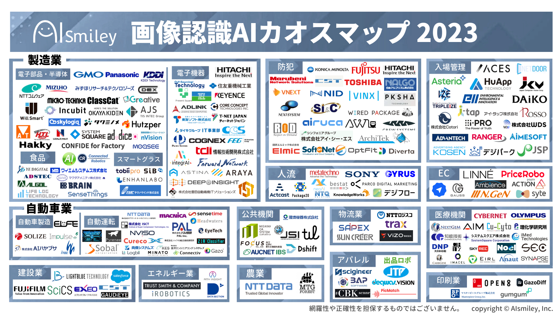本資料は、画像認識AIソリューションを提供している企業のプレスリリースや製品サイト、導入実績などの公開情報を基に作成しております。AIポータルメディア「AIsmiley」では「画像認識AIカオスマップ」を過去に数度公開していますが、近年の画像認識AIサービス数の増加に合わせて掲載数を増やし、最新版として作成しました。