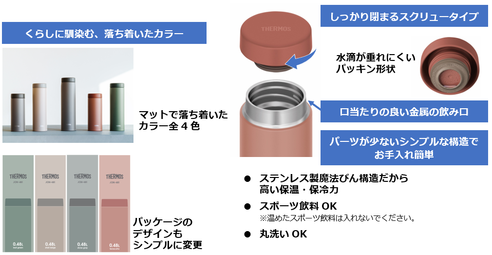近年のマイボトル市場においても消費者ニーズは多様化しており、よりシンプルな見た目、構造を好む方が一定数います。このたびの新製品では当社製品の中でも最もシンプルな構造で人気の高いJONシリーズをベースに、新しいコンセプトの新カラーを採用しました。JONシリーズはフタを回して開閉するスクリュータイプで口当たりの良い金属の飲み口の製品です。見た目のシンプルさはもちろん、製品構造もシンプルで、本体、フタ、パッキンと少ないパーツのためお手入れも簡単です。