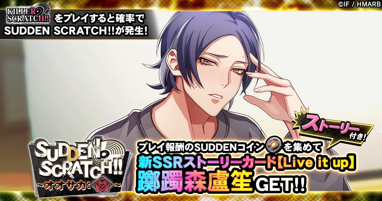 イベント期間中、KILLER SCRATCH!!をプレイするとライズ消費量に応じた確率でSUDDEN SCRATCH!!が発生します。SUDDEN SCRATCH!!をプレイすると、通常の報酬アイテムの他、限定アイテム「SUDDENコイン」を獲得することができます。「SUDDENコイン」を集めることで、ストーリーカードSSR【Live it up】躑躅森盧笙と交換することが可能です。
