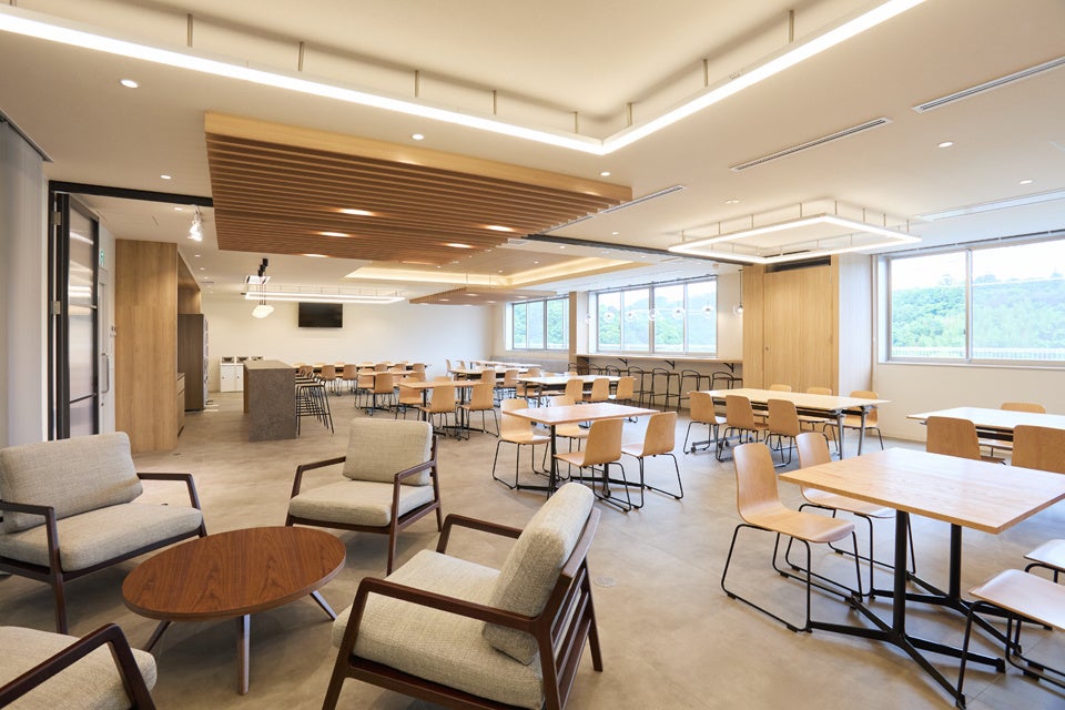 オフィスエリアは、サンゲツグループが空間デザイン・設計を担当。外光を効果的に取り入れた開放的な食堂は、可動間仕切りにより会議室としても使用できるなど、空間を有効活用しつつ、従業員がリラックスして働ける環境を整えています。