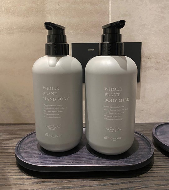 主な原料植物は、有機JAS 認証を取得した里山・自社農園で化学肥料を使わず育てており、育成状態を見極めながら旬の時期に手摘みで収穫し植物まるごとから栄養素を抽出しエキス化しています。また、各容器は環境負荷を軽減する取り組みとして、90% 以上がサトウキビの廃液由来の素材でできているバイオマスPE を採用しており、本来捨てられていた原料を再利用できる上、バイオマスPE は通常の樹脂と比較して、製造・輸送・廃棄までのCO2 の排出量を約7 割削減しています。こういった製品づくりに対する真摯な姿勢とサステナブルな取り組みが評価され、積極的にリサイクルに取り組み、飲料水を提供する浄水器専用の水栓を全室に備えるなど、環境に配慮したサステナブルな取り組みを行う「ホテル虎ノ門ヒルズ」での採用に至りました。