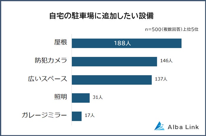 「自宅の駐車場の不満」を聞いたところ、1位は「屋根(188人)」でした。2位「防犯カメラ(146人)」、3位「広いスペース(137人)」も100票以上を集めています。