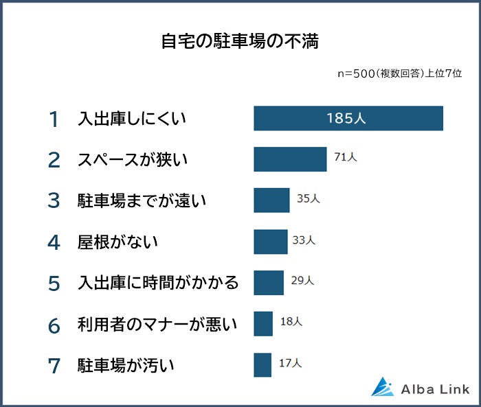株式会社AlbaLink(本社:東京都江東区、代表取締役:河田 憲二)は、自宅(マンション含む)に駐車場がある500人を対象に「自宅の駐車場の不満に関する意識調査」を実施し、そのデータをランキングにしました。
