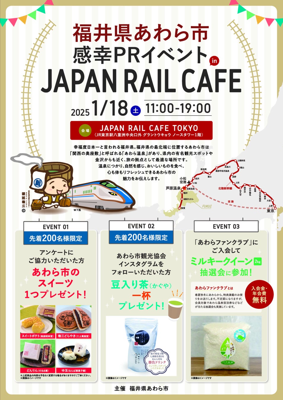 2025年1月18日(土)、東京駅直結の「JAPAN RAIL CAFE TOKYO」で、あわら市の魅力を発信し、観光に関するアンケート調査を実施します。あわら市では、令和6年3月の北陸新幹線芦原温泉駅開業を転機とし、今後は全国、世界から注目されるような魅力ある観光地を目指しています。
