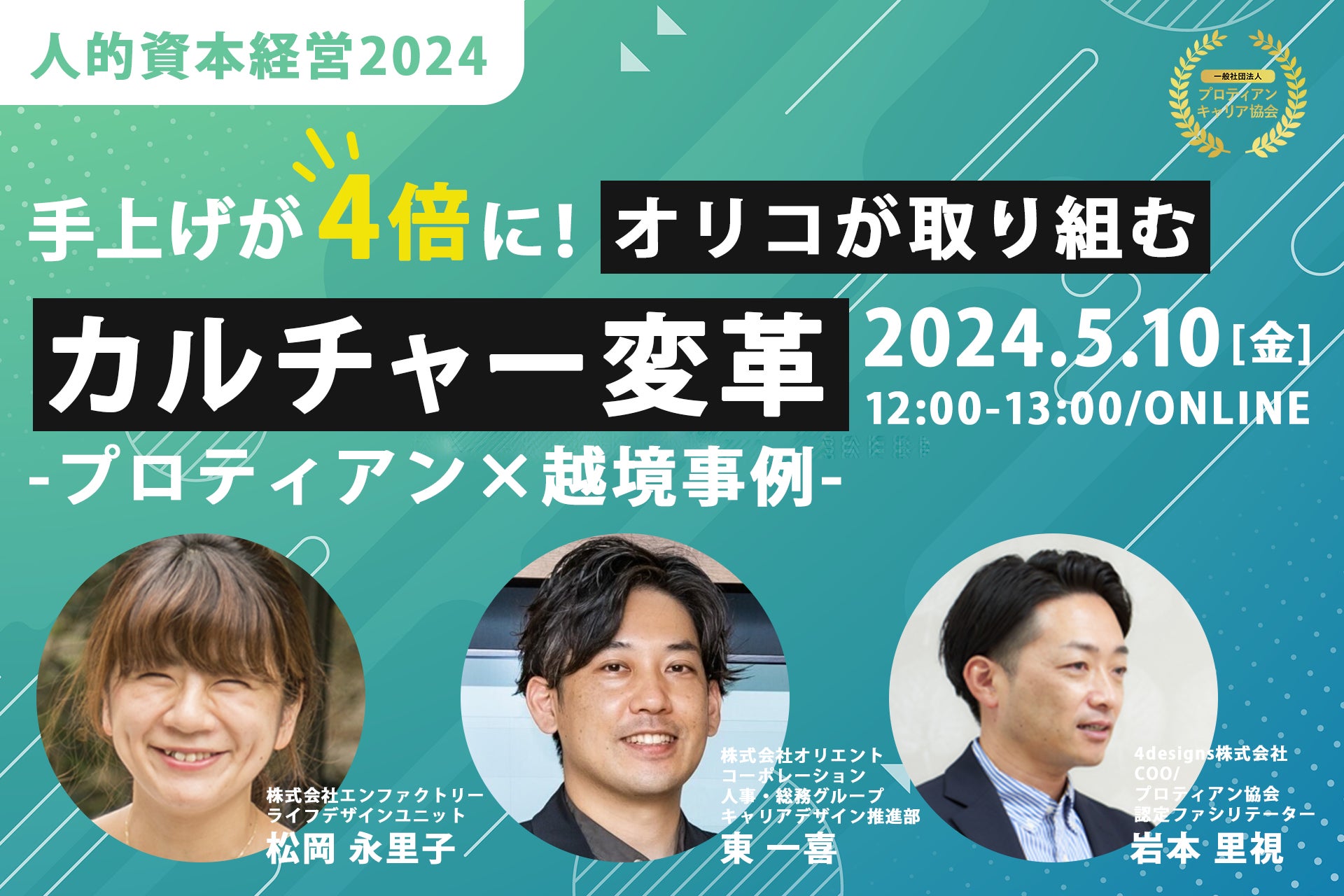 一般社団法人プロティアン・キャリア協会(東京都新宿区、代表理事:田中研之輔・有山徹、以下「当協会」)は、組織と個人のより良い関係構築と個人の主体的なキャリア開発を支援する団体です。この度、2024年5月10日(金)12時から13時に「【人的資本経営2024】手上げが4倍に!オリコが取り組むカルチャー変革~プロティアン×越境事例~」をオンラインで開催します。