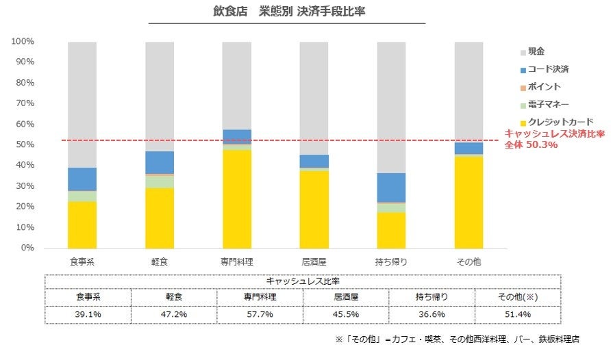 業態別で見ると、キャッシュレス決済利用は、1位の専門料理が49.9%で前月より0.1pt減少した。