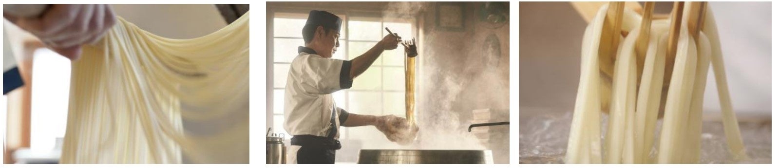 一軒一軒すべての店で、100%国産小麦、水、塩のみから打つうどんを水で締めず茹で釜から直接盛り付ける「釜抜き麺」でご提供いたします。釜抜き麺は、表面が少し毛羽立ち、ふわふわもちもち食感が特長で、牡蠣の旨みが染み出した玉子あんかけがよく絡み、すする度に口いっぱいに濃厚な味わいが広がります。