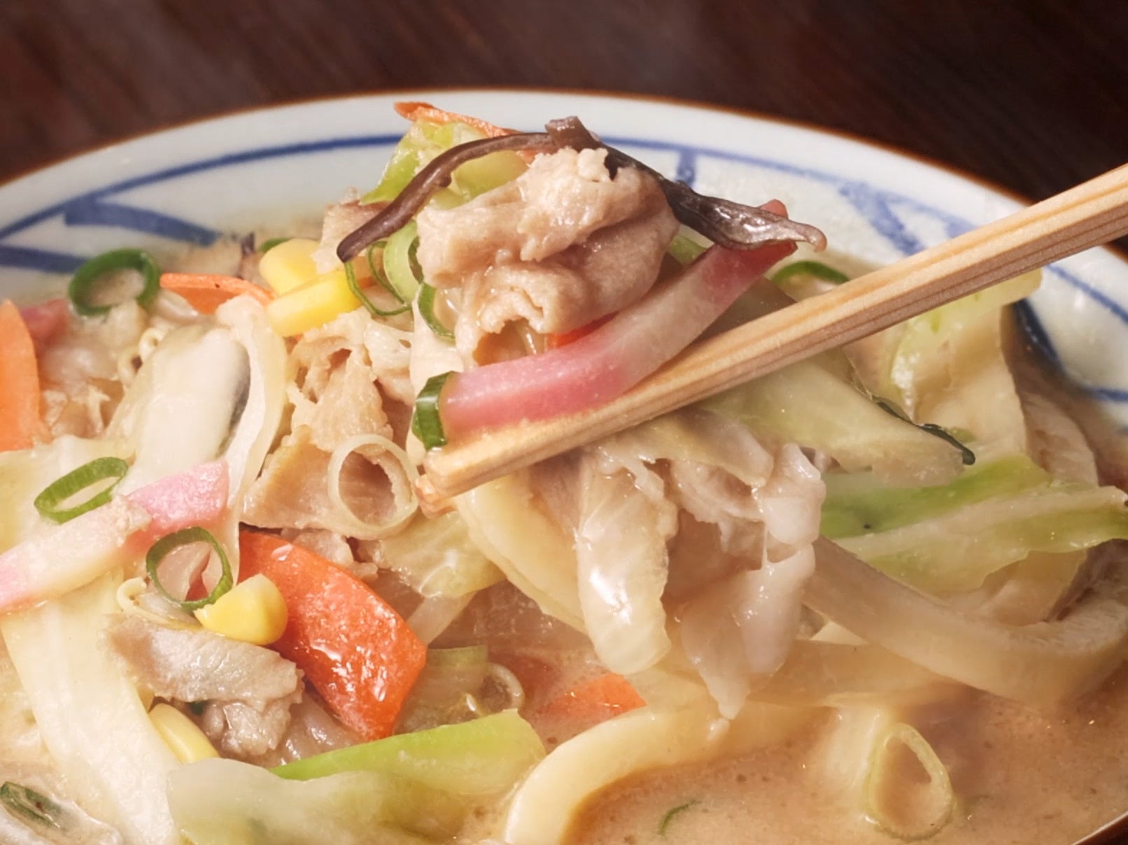 彩り豊かな具材は、豚肉、キャベツ、にんじん、かまぼこ、とうもろこし、玉ねぎ、きくらげ、もやしの8種類。打ち立てうどんとの絡みを考えて、具材や量のバランスを調整しています。豚肉を入れることで、脂の甘さが加わりコクが生まれます。
