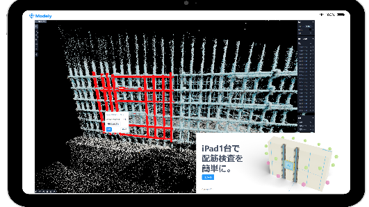「Modely」は、LiDAR(※1)付のiPadやiPhone などの汎用機材やレーザースキャナーなどで取得した点群からモデルを自動生成することで、現場で配筋検査の項目の合否判定、帳票作成、帳票送付を完了できるシステムです。