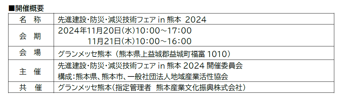「先進建設・防災・減災技術フェアin熊本2024」は自然災害からの復旧・復興と、豊かで安心・安全な社会基盤構築の実現、幅広い産業分野における防災・減災・BCPの構築と災害発生時の広域連携の推進を目指す展示会です。