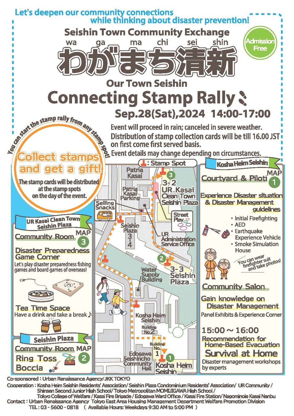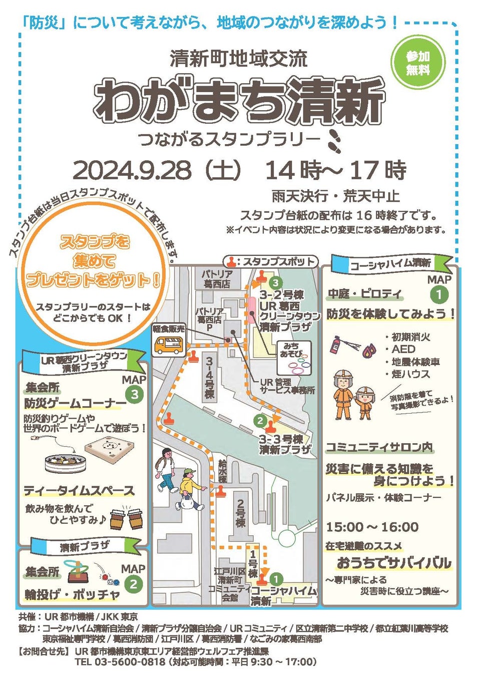 JKK東京(東京都住宅供給公社:東京都渋谷区、理事長:中井敬三、以下「JKK」)と独立行政法人都市再生機構東日本賃貸住宅本部(東京都新宿区、本部長:井添清治、以下「UR」)は、江戸川区に所在するJKK賃貸住宅「コーシャハイム清新」及びUR賃貸住宅「葛西クリーンタウン清新プラザ」において、「“わがまち清新”つながるスタンプラリー」(以下「本イベント」)を令和6年9月28日(土曜日)に開催します。