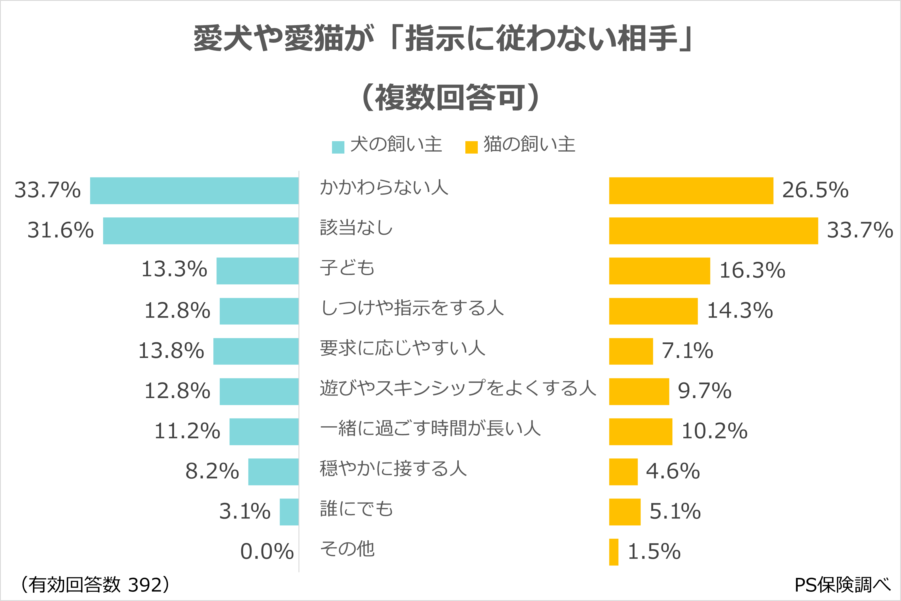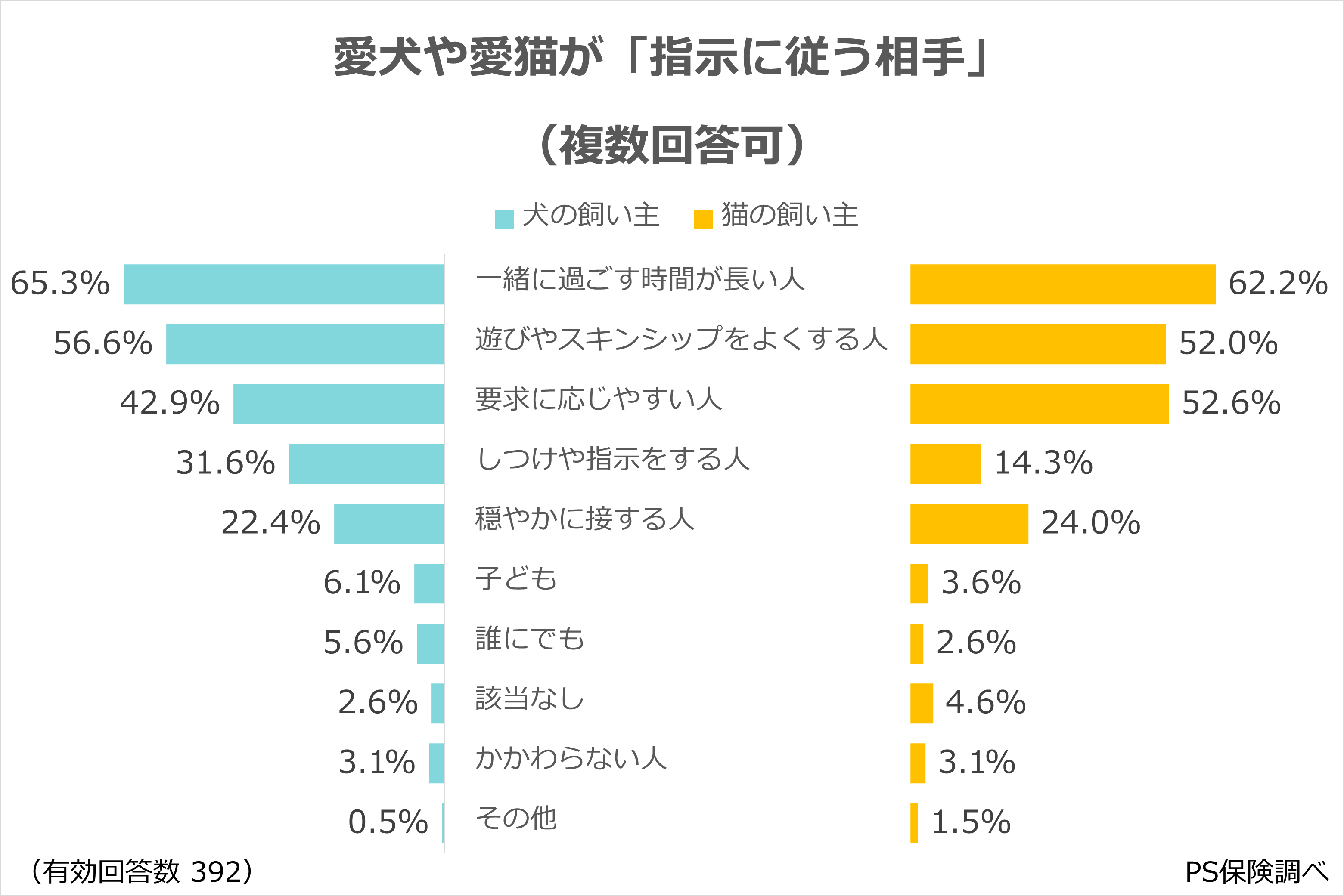 注目したいのは「しつけや指示をする人」(31.6%)の存在で、猫(14.3%)と比べて倍以上の差があります。凛としたリーダーシップが、犬には確かに届いているようです。