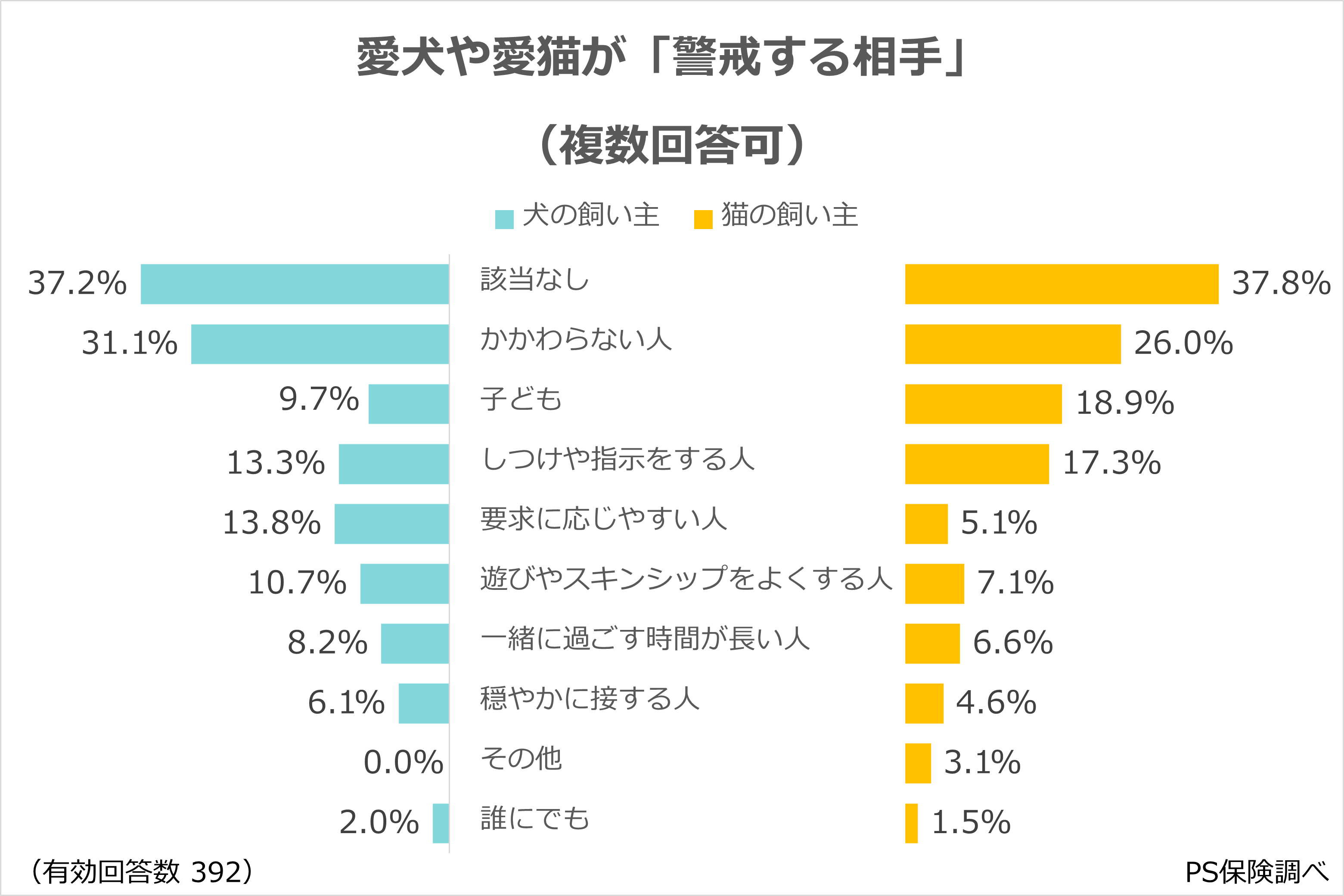 愛犬も愛猫も、誰も警戒しない「該当なし」が最多(犬:37.2%、猫:37.8%)。