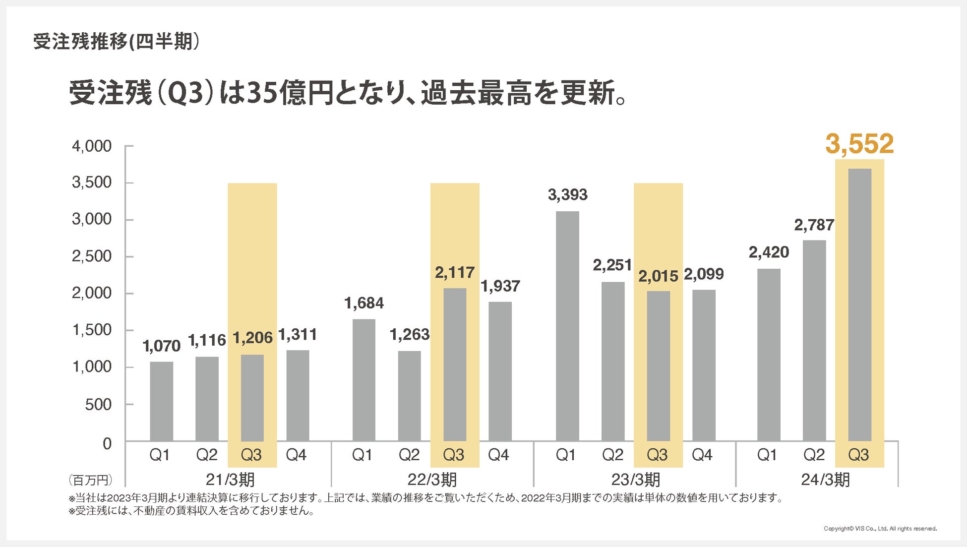 第3四半期の受注残は35億円となり、四半期として過去最高を更新しました。
