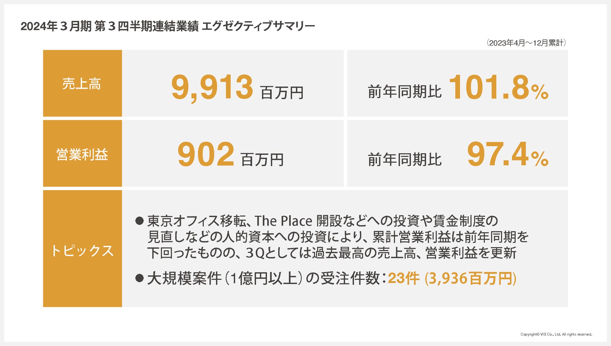 ワークデザインを手がける株式会社ヴィス(本社:大阪市北区、代表取締役社長:金谷智浩、東証スタンダード:5071)は、2024年2月14日、2024年3月期 第3四半期連結業績を発表しました。2024年3月期 第3四半期の連結売上高は9,913百万円で前年同期比101.8%、連結営業利益は902百万円で前年同期比97.4%と、第3四半期として売上高、営業利益ともに過去最高を更新して着地しました。