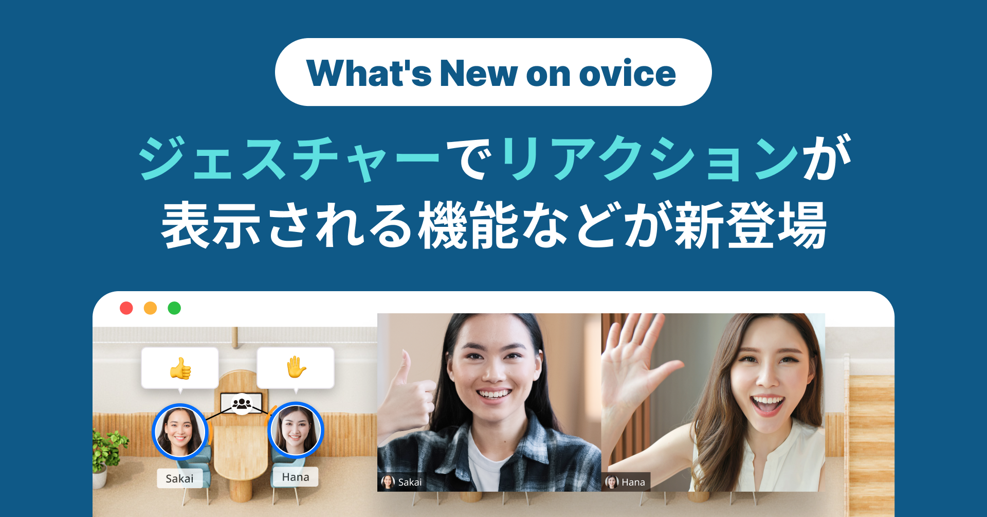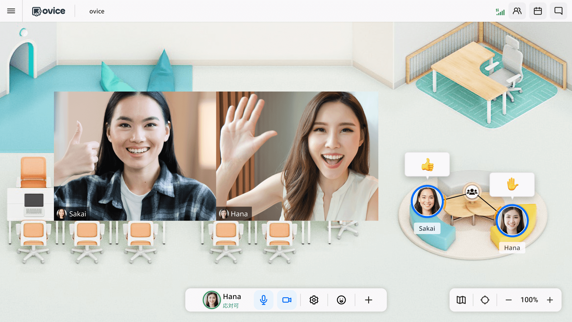 ovice上でカメラをオンにし、親指を立てる「サムズアップ」や「挙手」などのジェスチャーを行うと、そのリアクションの絵文字がアバターから吹き出しで表示される機能が公開されました。
