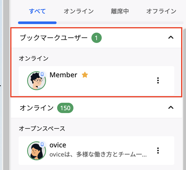 最大100ユーザーまでブックマークでき、ブックマークしたユーザーはユーザーリストの上部に表示されます。これにより、自チームのメンバーの状態をユーザーリストから簡単に確認できるようになりました。