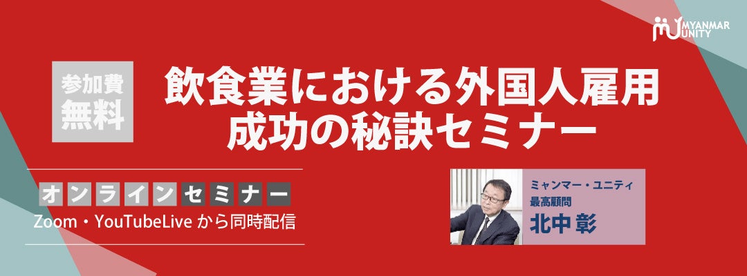 そこでこの機会に、ミャンマー政府認定No.1人材送り出し機関「ミャンマー・ユニティ」は、「飲食業における外国人雇用 成功の秘訣 セミナー」を10月21日に、オンラインで無料にて開催いたします。