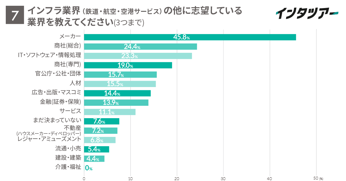 設問7では、設問6でインフラ業界(鉄道・航空・空港サービス)を「受ける」「受けるかも」と回答した学生に、そのほかに志望している業界を聞きました。
