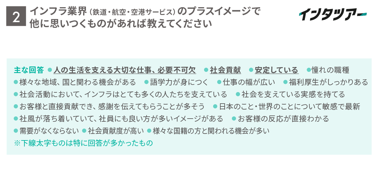 Q2. インフラ業界(鉄道・航空・空港サービス)のプラスイメージで他に思いつくものがあれば教えてください(自由記述)