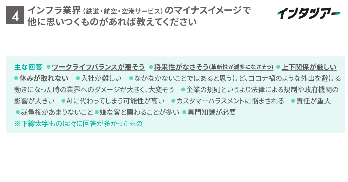 Q4. インフラ業界(鉄道・航空・空港サービス)のマイナスイメージで他に思いつくものがあれば教えてください(自由記述)