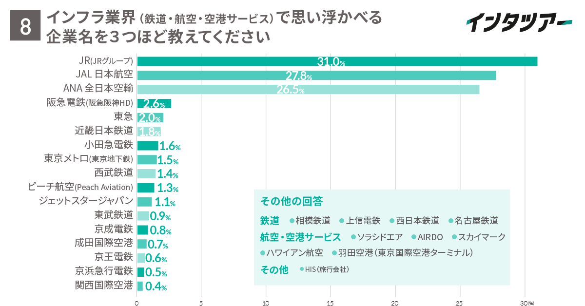 設問8では、インフラ業界(鉄道・航空・空港サービス)で知っている企業名を3社挙げてもらいました。