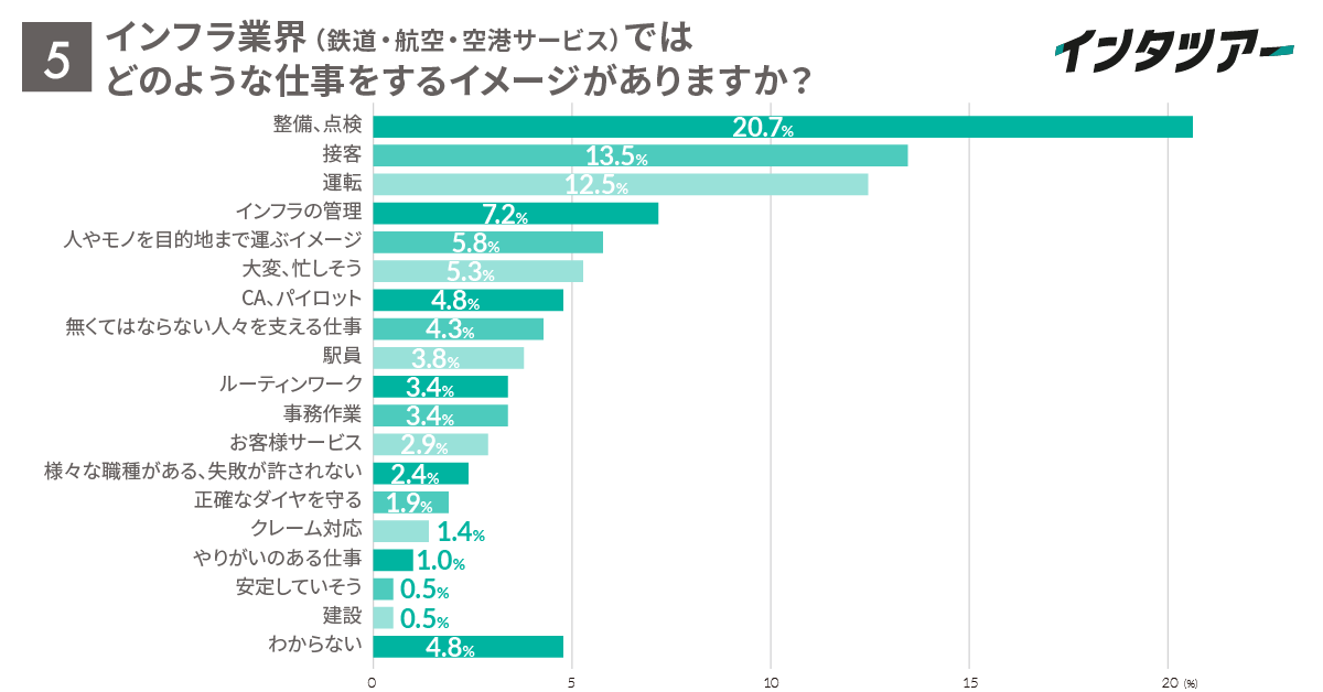 最も多かったキーワードは「整備、点検」20.7%で、メンテナンス関連の仕事が最もイメージされているようです。