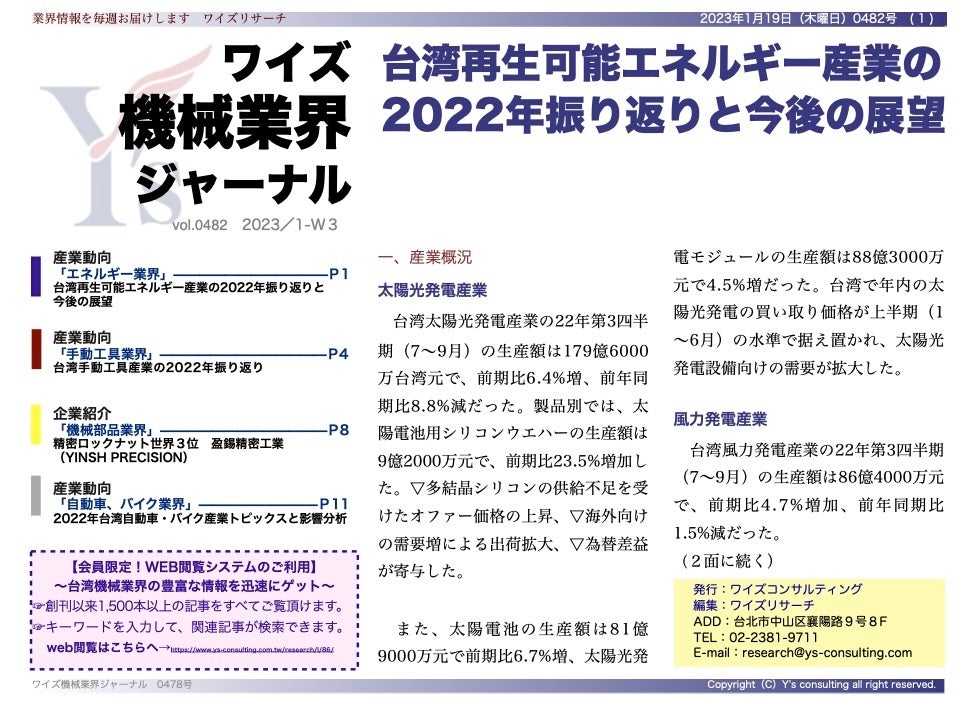 ワイズコンサルティング グループ(本社:中華民国台北市、代表取締役:吉本康志)は台湾機械業界専門誌「ワイズ機械業界ジャーナル」の2023年1月第3週号を発行しました。今週号では、エネルギー業界、手動工具業界、精密ロックナット世界3位のYINSH PRECISIONと自動車・バイク業界を紹介します。
