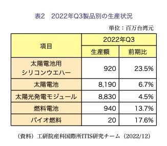 台湾太陽光発電産業の22年第3四半期(7~9月)の生産額は179億6000万台湾元で、前期比6.4%増、前年同期比8.8%減だった。製品別では、太陽電池用シリコンウエハーの生産額は9億2000万元で、前期比23.5%増加した。▽多結晶シリコンの供給不足を受けたオファー価格の上昇、▽海外向けの需要増による出荷拡大、▽為替差益が寄与した。