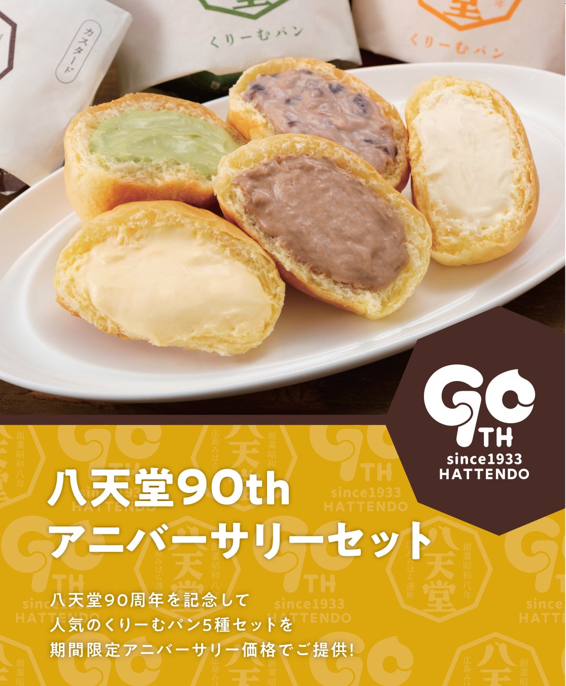 【八天堂店舗】創業90周年を記念し人気の「くりーむパン 5種セット」を感謝の気持ちを込めて期間限定アニバーサリー価格で販売