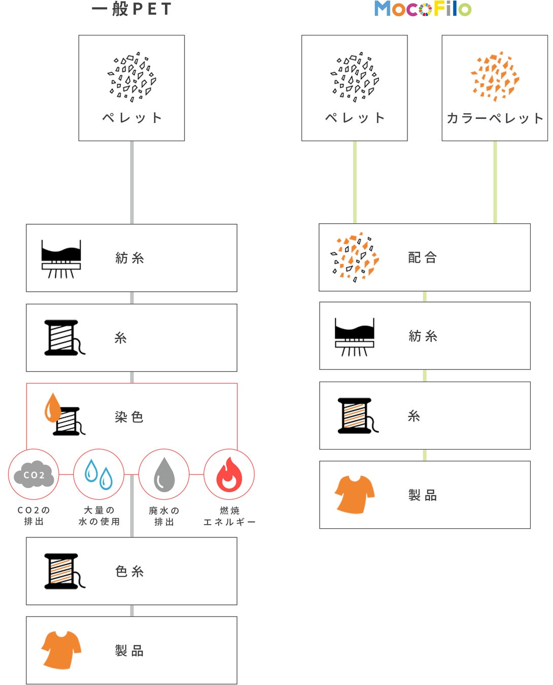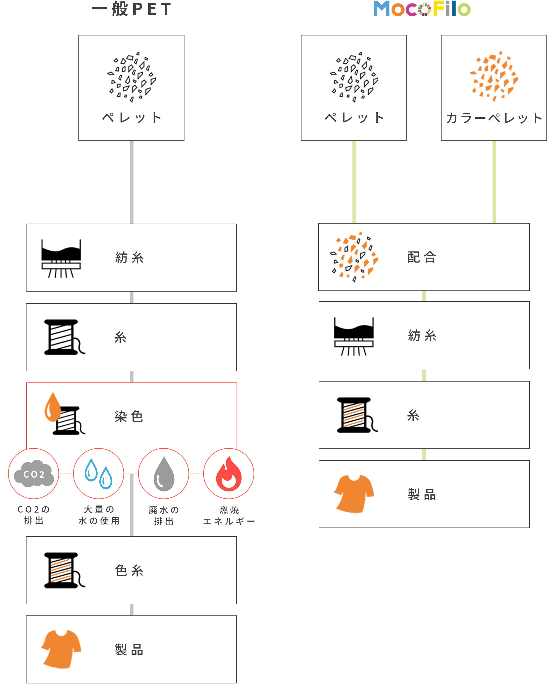 MocoFilo®はポリエステル原着糸で、水使用量やCO² 排出量、燃焼エネルギーを大幅に削減し、紡糸段階で着色されているため、染色工程を必要としない環境に優しい工程で製造されています。染色生地とMocoFiloを使用した生地を比較すると、水の使用量は約66%削減することができ、CO2排出量も約70%削減することが可能です。