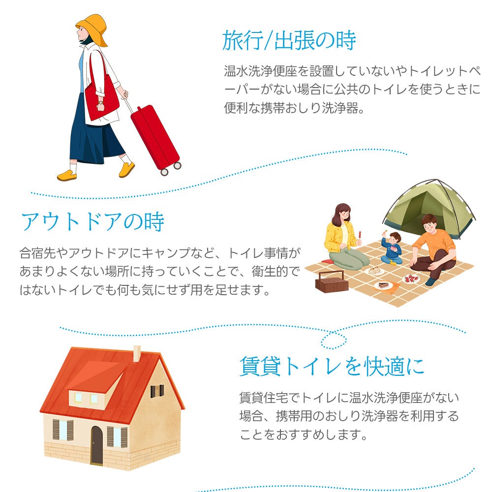 「外でも清潔を保ちたい」「災害時にも安心できるアイテムが欲しい」そんな声に応える本製品は、持ち運びやすく使いやすいデザインに加え、多彩な機能を搭載。アウトドア・旅行・介護・防災など、あらゆるシーンで活躍します。