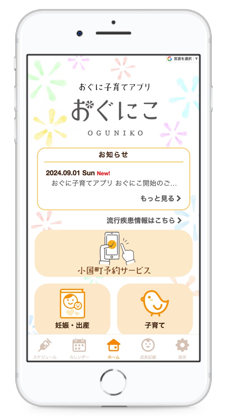 小国町では、誰もが安心して子どもを産み育てることができる環境整備・子育て支援施策に取り組み、「親子で住めるまちづくり」をすすめております。この度、妊娠期から子育て期までの切れ目ない支援の一環として、タイムリーな情報発信や、子育て世代の多様化するニーズに対応するため、「おぐに子育てアプリ おぐにこ」を導入いたしました。電子母子手帳機能、予防接種や乳幼児健診のスケジュール管理、町からの子育て情報の配信など、様々な機能を搭載し、安心して子育てができるよう支援していきます。どなたでもご登録ができますので、ぜひご家族の皆さんでご活用ください。