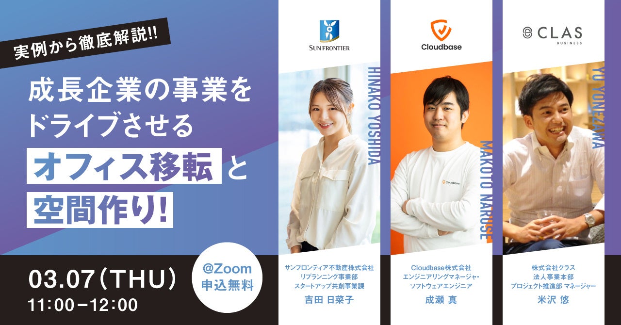 3月7日(木)11時より、クラス様との共催ウェビナーを開催いたします。ゲストには、2024年2月に11.5億円の資金調達に成功したCloudbase株式会社様(読み方:クラウドベース)をお呼びし、「実例から徹底解説!!成長企業の事業をドライブさせるオフィス移転と空間作り!」をテーマに、オンラインで配信いたします。ぜひご参加ください。