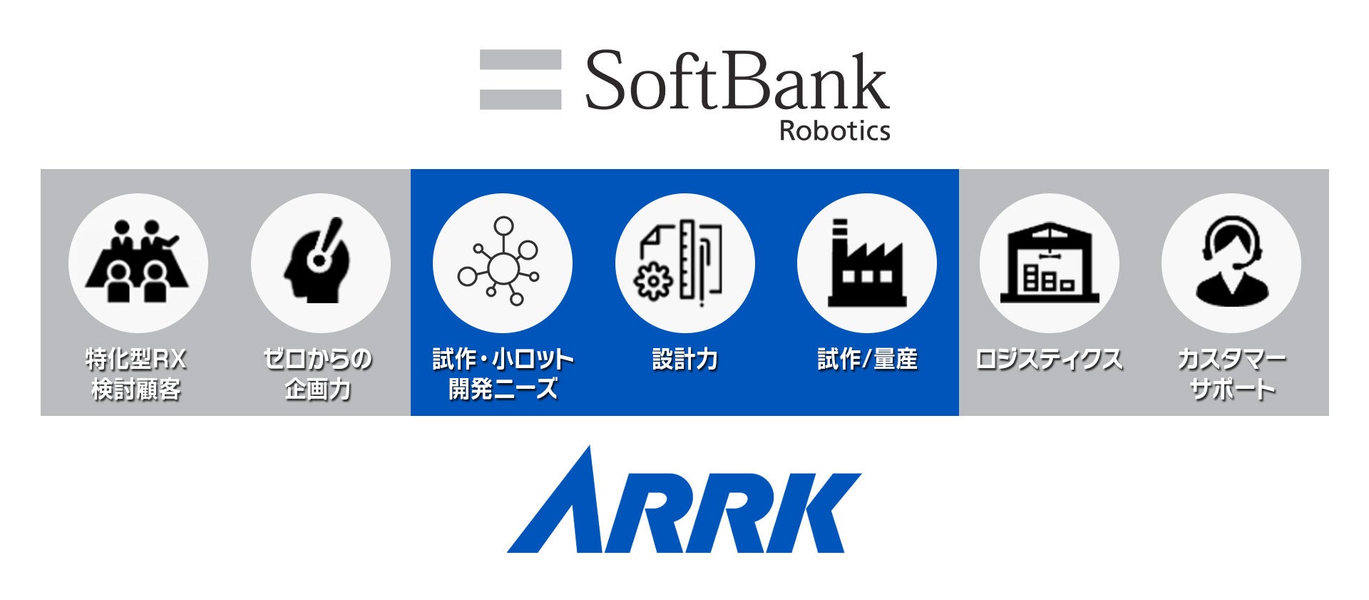 ソフトバンクロボティクス株式会社(本社:東京都港区、代表取締役社長:冨澤文秀、以下「ソフトバンクロボティクス」)と三井化学株式会社(本社:東京都中央区、代表取締役社長:橋本修、以下「三井化学」)の100%子会社の株式会社アーク(本社:大阪府大阪市、代表取締役社長:両角直樹、以下「アーク」)は、ロボットの開発から量産・運用までを一気通貫で支援するパートナーシップ契約を本日締結しました。 ソフトバンクロボティクスが包括的にロボット開発を支援する「Robot Support Service(以下「RSS」)*1」とアークが取り組む顧客のロボット開発から生産までを支援する機能を結ぶことで、試作・小ロット開発・量産・運用に対応できる強固な体制を実現します。