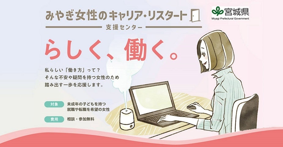 宮城県が設置している「みやぎ若年者就職支援センター(通称: みやぎジョブカフェ)」内に女性のための再就職等支援施設「みやぎ女性のキャリア・リスタート支援センター」を開設し、キャリアコンサルティング業務など各種就職支援業務や仕事と子育ての両立に向けた「働き方改革」に関する啓発事業などを実施します。