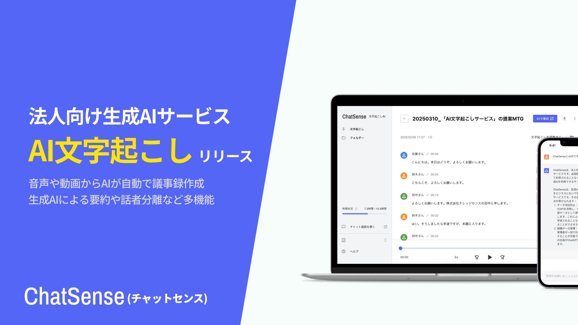 法人向け「文字起こしAI」サービスをリリース。月額980円~利用可能。生成AIを活用して高精度な議事録を自動作成。ChatSense