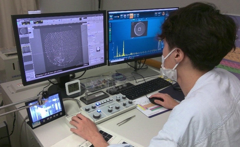 本インターンシップは5日間実施され、鈴鹿高専が保有する、高度な分析機器を使用し、現在研究を進めているナノデバイス上の細胞外小胞(エクソソーム)の観察を行いました。