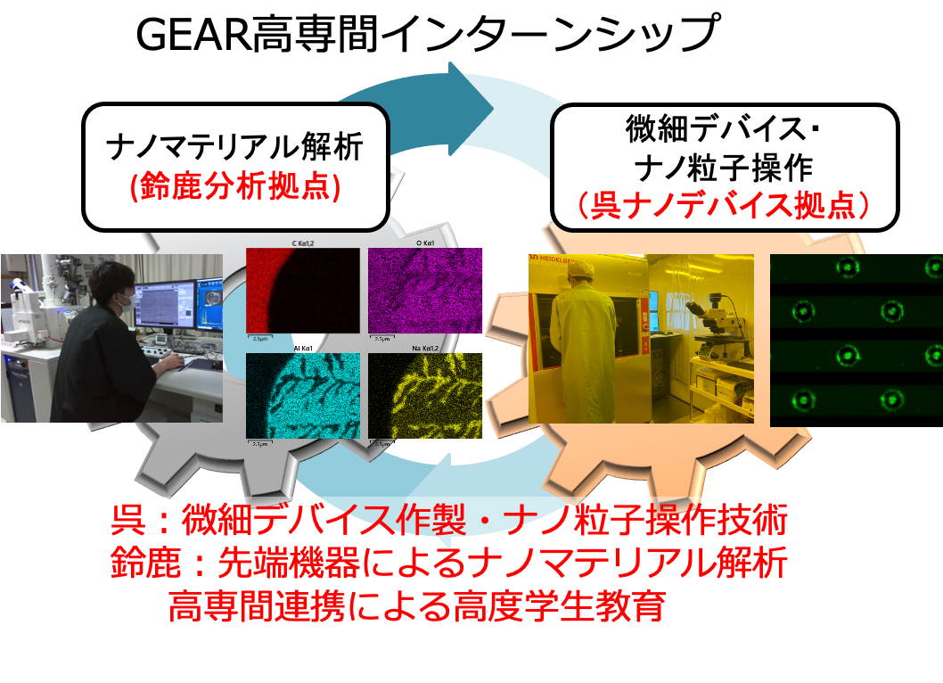 GEAR5.0マテリアルユニットは鈴鹿高専を中核校として、呉高専(協力校)を含めた全国から5つの高専(鶴岡高専・小山高専・鈴鹿高専・呉高専・大分高専)からなります。各高専では、それぞれの得意なコアとなる保有技術を活かしたプラットフォームを形成し、高専間の連携のもと地域あるいは全国からの官民の課題解決に積極的に取り組んでいます。材料(マテリアル)の分野において、鈴鹿高専は共同研究推進センターに高度な先端分析拠点としての役割を担い、呉高専ではナノデバイス拠点のプラットフォームを形成しています。今回のインターンシップ受け入れ活動は、GEARマテリアル内での高専間連携の主要な事業の一つです。